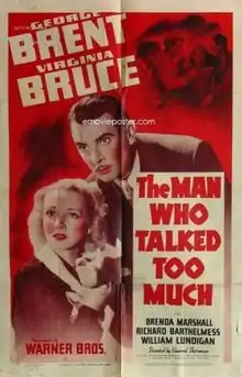 The Man Who Talked Too Much is a 1940 American drama film directed by Vincent Sherman and written by Walter DeLeon and Earl Baldwin. Starring George Brent, Virginia Bruce, Brenda Marshall, Richard Barthelmess, William Lundigan, George Tobias and John Litel, the film was released by Warner Bros. on July 16, 1940.[1]