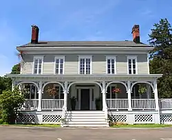 The main house is a two-story, five-bay frame building on a raised fieldstone foundation. The gabled metallic roof has cornice returns and is pierced by four chimneys at the corners. The eastern (front) facade has a full-length flat-roofed veranda with cornice bracketry and scroll-sawn segmentally-arched knee braces. Small Palladian windows are located in the gable apexes on the north and south, with two quarter-round attic windows on either side.[1]