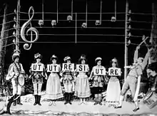 A music master leads his band to a field where five telegraph lines are strung on utility poles. Hoisting up a giant treble clef, he turns the set of lines into a giant musical staff. He then uses copies of his own head to spell out the tune for "God Save the King," and his band joins in.