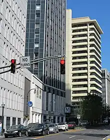 South side of Marietta Street looking northwest from Five Points - left to right: Georgia State's Andrew Young School of Policy Studies, The Metropolitan, and Five Points Plaza.