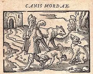 The Mischievous Dog is one of Aesop's Fables, of which there is a Greek version by Babrius and a Latin version by Avianus. It is numbered 332 in the Perry Index.[1] The story concerns a dog that bites the legs of others. Its master therefore ties a bell around its neck to warn people. The dog, thinking the bell is a reward, shows it off in the streets until an older dog reminds him that the bell is not a reward but a sign of disgrace. Victorian editors of the fables supplied the moral that 'notoriety is often mistaken for fame'.[2]