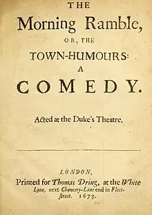 The Morning Ramble also known as The Mourning Ramble; Or, The Town-humours is a 1672 comedy play by the English writer Henry Nevil Payne. It was staged by the Duke's Company at the Dorset Garden Theatre with a cast that included Thomas Betterton as Townlove, Henry Harris as Merry, William Smith as Ruffle, Matthew Medbourne as Muchland, John Crosby as Rash, Cave Underhill as Fullam, Henry Norris as Breef, Jane Long as Betty Rash, Margaret Osborne as Lady Turnup and Anne Shadwell as Rose.[1]