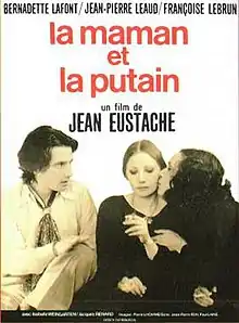 The Mother and the Whore (French: La maman et la putain) is a 1973 French film directed by Jean Eustache and starring Jean-Pierre Léaud, Bernadette Lafont and Françoise Lebrun. An examination of the relationships between three characters in a love triangle, it was Eustache's first feature film and is considered his masterpiece. Eustache wrote the screenplay drawing inspiration from his own relationships, and shot the film from May to July 1972.