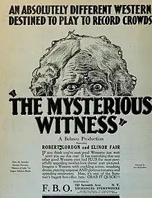The Mysterious Witness is a 1923 American silent Western film directed by Seymour Zeliff and starring Robert Gordon, Elinor Fair and Nanine Wright.[1]