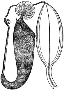 Danser recognised 65 species in total, of which 52 were given detailed treatments.[note a] This number included 17 newly described taxa: N. carunculata (later synonymised with N. bongso),[3][4] N. clipeata, N. dubia, N. ephippiata, N. fusca, N. inermis, N. insignis, N. leptochila (later synonymised with N. hirsuta),[4][5] N. mollis, N. paniculata, N. papuana, N. pectinata (later synonymised with N. gymnamphora),[3][4] N. petiolata, N. pilosa, N. spectabilis, N. tobaica, and N. tomoriana. All were described in great detail, with many accompanied by line drawings. Danser synonymised N. edwardsiana with N. villosa, N. hemsleyana with N. rafflesiana, and N. ramispina with N. gracillima;[1][6] all three were later reinstated as valid species.[4][7]