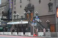 The brick and brownstone facade was inspired by Venetian architecture.[12][13] When the theater was completed in 1900, the main facade measured 70 ft (21 m) tall and 100 ft (30 m) wide. The New-York Tribune described it as being made of "iron, brownstone, and Powhatan brick".[11] At the front of the theater, a brownstone stoop with two staircases rises from ground level to the second story. Ten wrought-iron street lights decorate the perimeter.[13] The current stoop is a replica of the theater's original stoop,[14] which led to the auditorium's second balcony level; the original lobby was below the original stoop.[11] The original stoop was removed in 1910 before being restored in 1995.[12][15] The New York City government had to approve the installation of the current stoop because it extends onto the sidewalk of 42nd Street.[7][8]