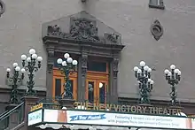 When Belasco renovated the theater in 1902, he installed a wrought iron and glass canopy in front of the entrance,[16][17] which was also eliminated in 1910.[12] Prior to the New Victory's restoration, there had been an Art Deco-style marquee in front of the entrance, dating from 1932.[13][18] This was removed in 1995, along with a piece of the neighboring Lyric Theatre's marquee.[13][19][20]