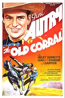The Old Corral is a 1936 American Western film directed by Joseph Kane and starring Gene Autry, Smiley Burnette, and Irene Manning. Based on a story by Bernard McConville, the film is about a sheriff of a small western town who sings his way into a relationship with a singer from a Chicago nightclub who earlier witnessed a murder.[1] The supporting cast features Lon Chaney Jr. and Roy Rogers.