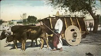 The Greek fabulist Babrius collected two variant fables that told of oxen straining to pull a laden wagon with creaking wheels. In one the oxen reprove the cart for complaining when it is they who have the heaviest work to do.[3] In the other, it is the angry waggoner who points this out.[4]
