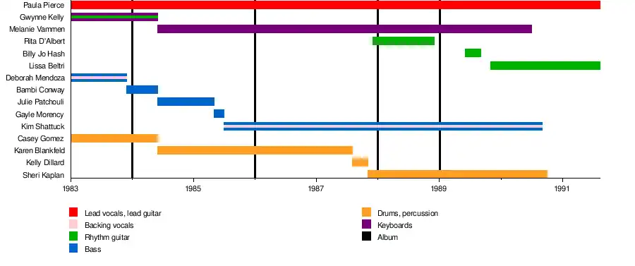| Past members | Paula Pierce Deborah Mendoza Gwynne Kahn Casey Gomez Bambi Conway Melanie Vammen Julie Patchouli Karen Blankfeld Gayle Morency Kim Shattuck Kelly Dillard Sheri Kaplan Rita D'Albert Billy Jo Hash Lissa Beltri Note: Shown in order of joining. |