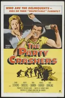 The Party Crashers is a 1958 American drama film directed by Bernard Girard and written by Bernard Girard and Dan Lundberg. The film stars Mark Damon, Bobby Driscoll (in his last feature film role), Connie Stevens, Frances Farmer (in her last feature film role), Doris Dowling, and Gary Gray.[1][2] The film was released in September 1958, by Paramount Pictures.