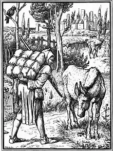 The story begins with a lone pedlar walking along a road carrying his pack on his back. The pedlar meets a donkey and asks him if he might carry the heavy pack for two gold pieces. The pedlar lies and says he has the gold pieces and the pedlar and donkey carry on down the dusty road. Further up the road the two travellers meet a raven; the donkey asks him to chase away the flies swarming around him. The donkey deceives the raven by telling him that he can pay three gold pieces for the job; the raven concurs with the price and the three continue their journey. In time they meet a hedge-sparrow; the raven tells the hedge-sparrow that if he fetches the hungry raven worms, in return the raven will pay him four pieces of gold. However, the raven is lying as he does not have the money. The hedge-sparrow agrees to the contingencies and all four make their way down the road; the donkey with the pedlar’s pack, the raven sitting on the donkey’s back to shoo away the flies, and the hedge-sparrow, supplying the raven with worms.