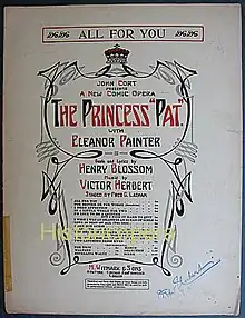 The Princess Pat is an operetta in three acts with music by Victor Herbert and book and lyrics by Henry Blossom. While set on Long Island, New York, the story follows the American born Princess di Montaldo, a.k.a "Princess Pat" (formerly Patrice O'Connor), who is married to the Italian Prince Antonio di Montaldo, a.k.a. "Prince Toto". Unhappy that her husband ignores her, she is intent on winning back his attention and affections.[1] Herbert wrote the piece as a vehicle for the soprano Eleanor Painter.[2]