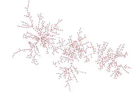 The basic "skeleton" of the network is developed by imposing on it the strongest links which were not necessarily in the MST by employing a threshold on the proximity values; they chose to include all links of proximity greater than or equal to 0.55. This produced a network of 775 nodes and 1525 links. This threshold was chosen such that the network exhibited an average degree equal to 4, a common convention for effective network visualizations. With the framework complete, a force-directed spring algorithm was used to achieve a more ideal network layout. This algorithm considers each node to be a charged particle and the links are assumed to be springs; the layout is the resulting equilibrium, or relaxed, position of the system. Manual rearranging untangled dense clusters to achieve maximum aesthetic efficacy.