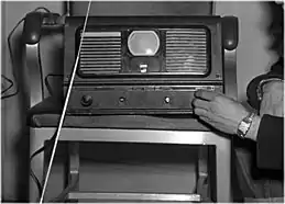 The televised play was received on televisions that were octagonally shaped and about ten inches (250 mm) high and four inches (100 mm) in depth. The front panel upper part had a three inch square aperture through which the moving picture was viewed. There were knobs on the lower part which controlled how the radio signals for the television part were received.[4]