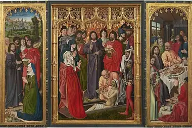 The central panel shows the resurrection itself, with one side panel showing Christ welcomed by Lazarus' sisters Mary and Martha and the other showing Christ's feet being washed in the house of the Pharisee. When closed, the side panels show portraits of the work's commissioner Francesco Coppini (bishop of Prato and papal legate to pope Pius II in Flanders and England) praying with two of his servants before an image of the Madonna and Child. The work is also signed Nicolaus Frumenti absolvit hoc opus XV HL. Junii MoCCCCoLXI on the exterior. It remains in its original Flemish-style frame with a set of light gilded arches inspired by the arcades of Gothic architecture seen in French cathedrals of the time.