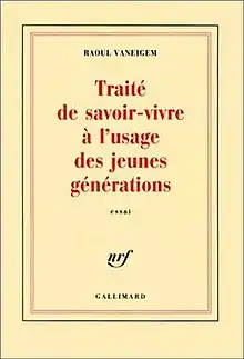 The Revolution of Everyday Life (French: Traité de savoir-vivre à l’usage des jeunes générations) is a 1967 book by Raoul Vaneigem, Belgian author and onetime member of the Situationist International (1961–1970). The original title literally translates as, Treatise on Good Manners for the Younger Generations. John Fullerton and Paul Sieveking chose the title under which the work appears in English.