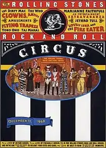 The Rolling Stones Rock and Roll Circus was a concert film hosted by and featuring the Rolling Stones, filmed on 11–12 December 1968. It was directed by Michael Lindsay-Hogg, who proposed the idea of a "rock and roll circus" to Jagger.[3] The show was filmed on a makeshift circus stage with Jethro Tull, The Who, Taj Mahal, Marianne Faithfull, and the Rolling Stones. John Lennon and his fiancee Yoko Ono performed as part of a one-shot supergroup called The Dirty Mac, featuring Eric Clapton on guitar, Mitch Mitchell (of The Jimi Hendrix Experience) on drums, and the Stones' Keith Richards on bass. The recently formed Led Zeppelin had been considered for inclusion, but the idea was rejected.[4] (As the Who's Pete Townshend recalled, an earlier idea for a circus-themed concert tour had been floated; it would have featured the Stones, the Who, and the Small Faces.)[5]