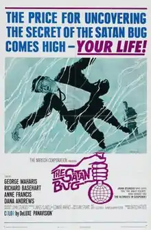 The Satan Bug is a 1965 American crime science fiction suspense film from United Artists, produced and directed by John Sturges, that stars George Maharis, Richard Basehart, Anne Francis, and Dana Andrews. The screenplay by James Clavell and Edward Anhalt was loosely based on the 1962 novel of the same name by Alistair MacLean, written under the pseudonym Ian Stuart. The film score was composed by Jerry Goldsmith. The film featured the first use of a stabilized camera mount, invented by Nelson Tyler, placed on a helicopter.[3][4]