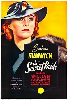 The Secret Bride is a 1934 American drama film directed by William Dieterle and starring Barbara Stanwyck and Warren William. Based on the play Concealment by Leonard Ide, the film is about governor's daughter and a state attorney general who are forced to keep their marriage secret after the governor is accused of a crime.[1] The initial plot concerns the governor taking a bribe in exchange for pardoning a white collar criminal. The investigation is about political corruption.