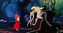 One of the earliest drafts of the film was written by Steven Barnes, who received a creative consultant credit in the final product and was closer to the original novel.[13] The story would have focused more on the rats and their time at NIMH as it did in the book, which was reduced to a short flashback in later revisions to bring Mrs. Brisby and her plight into the forefront. It also included (from the book) a female rat named Isabella (described as "a young, cute, somewhat motor-mouthed rat with a crush on Justin"), who was ultimately left out and much of her dialogue given to Nicodemus. A revised synopsis dated July 2, 1980, by an unattributed author would take the film closer to its completed form, which ended with the mysterious disappearance of the rats, leading the characters and audience to wonder if they ever really existed, or were just an elaborate illusion.[14]