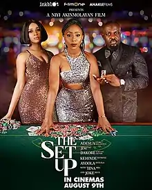 The Set Up is a 2019 Nigerian crime thriller film directed by Niyi Akinmolayan.[2][3] The film stars Dakore Akande, Adesua Etomi and Kehinde Bankole in the lead roles.[4] The plot of the film is based on a young woman who drops her childhood innocence as she delves to become a criminal for survival. The film was released on 9 August 2019 and received mixed reviews and was also criticised for too much plot twist and turns in the screenplay.[5][6] Despite the mixed reception, the film became a success at the box office.[7] It was also streamed via Netflix on 22 April 2020.[8][9]