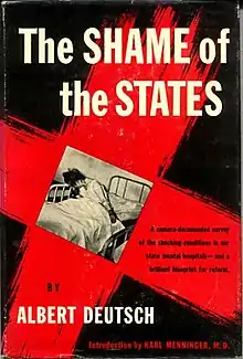 The Shame of the States is a 1948 book by journalist and social activist Albert Deutsch on the conditions of state mental hospitals in the United States the 1940s. Deutsch, praised as a crusader, nevertheless wrote in the preface of this book that "the day of the individual crusader is over."[1] Taking an historically informed approach, he called for a public reform movement as the only way to enact significant change of the state mental hospital system, emphasizing lack of state funding as the cause of the problems he witnessed (mainly the "twin diseases" of overcrowding and understaffing), and pointing towards a lack of public pressure on state representatives as the ultimate reason for the hospitals' limited budgets.[2]