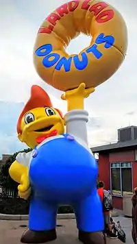 A large portion of the World Expo area at Universal Studios Florida and a portion of the Upper Lot at Universal Studios Hollywood were converted into a new themed area called Springfield (although Florida's version of Springfield would actually be a subsection of World Expo until 2016), based on iconic landmarks from The Simpsons such as Krusty Burger, Frying Dutchman, Lard Lad Donuts, Moe's Tavern, and a Duff Brewery. The park also added one amusement ride named "Kang & Kodos' Twirl 'n' Hurl", a Dumbo-esque spinning ride where patrons drive flying saucers around Kodos' head and attack Springfield residents.[30]