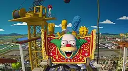 Approximately a minute later, Sideshow Bob suddenly hijacks his signal and takes control of the screen, telling riders that he is now in control of Krustyland. After threatening guests by saying no area in the park is safe from him, he starts the ride by flipping a switch from "thrilling" to "killing", which activates the vehicle causing it to virtually rise out of the room while telling them to enjoy the ride which is about to be destroyed with them on it. The ride simulator combines physical movement of the vehicle with on-screen motion. The experience continues with riders emerging onto a track with the Simpsons' vehicle in front of them. Bob is also nearby, operating a wrecking ball crane. The riders then ram into the Simpsons' vehicle, which can be seen taking a plunge. The rider's vehicle plunges soon after, revealing they are on the "Tooth Chipper" roller coaster (which was scheduled for demolition) involving a variety of drops and turns. Homer, who wasn't sitting down, gets hit by Bob's wrecking ball before it smashes into the track. With a portion of the track now missing, the riders fly into a different part of the coaster's layout along with Homer. The "steel" wrecking ball breaks free from its cable and rolls along the track chasing Homer and the riders. During the pursuit, the wrecking ball eventually runs over Homer.