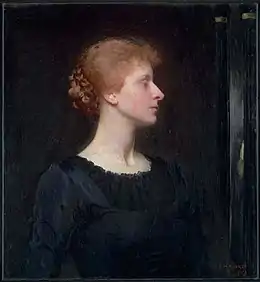 After studying in New York City and Paris, Thayer took a studio in Brooklyn in 1880. He traveled often, summering for the next few years in Nantucket or Pittsfield, Massachusetts; in 1881, he went to Hartford, Connecticut to paint Mark Twain, and in 1882 he spent the winter in a cottage owned by Henry Ward Beecher in Peekskill, New York.[3] In 1883, Thayer rented a home at Cornwell-on-Hudson, and built a studio on James Stillman's property.[4] It was there that he painted two portraits of the sisters, one of Bessie alone, completed in 1883, and the double portrait, which he worked on until January 1884.[4] Together, the paintings are quite different from his previous portraits, which had featured more opulent wardrobes in keeping with the fashionable style of the Paris Salon—an art reviewer had found fault with the "poor taste" of the glamorous finery of Thayer's 1881 Portrait of Mrs. William F. Milton, and thereafter the artist avoided ostentatious dress.[4]