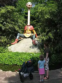 The fairy tale is well known in the Netherlands, thanks to it being part of several of the fairy tales exhibited in the theme park Efteling in Kaatsheuvel, Northern Brabant. A huge animatronic statue of the long-necked servant can be seen there since 1952, telling the story to all visitors on a repeated audio recording. This statue, called Langnek ("Longneck"), is also a mascot for the park.[2] In 1955, a little pond was dug around the stone on which Long-neck sits. A bust of the servant with the sharp eyesight, Bullet-eye, with a wasp on his nose stood next to Long-neck. In the late 1950s, Bullet-eye was removed and a smaller bust of a blindfolded Bullet-eye was placed upon a kiosk near Long-neck. Long-neck received a new head in the 1970s; and in 1979, his body and neck were renewed. In 2006, safety-fences were placed near the pond. The tale is voiced by Peter Reijnders, and can be read from a book in Dutch, English, French and German.