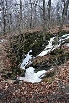The Snow Hole is located in the Taconic Mountains, New York, USA along the ridge line between Bald Mountain and the White Rock (Taconic Mountains). It is a crevasse in which snow can be found well into the summer. The Snow Hole can be accessed by hiking the Taconic Crest Trail about 2.75 miles north from the Petersburgh Pass parking area just off of Route 2. The Snow Hole is located at 42°45.538′N 73°16.840′W / 42.758967°N 73.280667°W. Finding the location of the Snow Hole can be confusing, as several maps (including Google maps and USGS Berlin quadrangle, 1:25,000 scale - 1988) mark the location of the Snow Hole summit at 42°44′37″N 73°16′30″W / 42.743671°N 73.275118°W. However, that is a separate mountain summit and not the actual Snow Hole. The posted hiking map at the kiosk to the Taconic Crest Trail at Petersburgh Pass has the location correctly identified. Typically the crevasse has snow at the bottom of it year round.