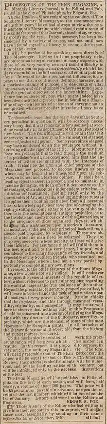 Though Poe thought of creating the journal as early as 1834, he first announced his prospectus in June 1840 immediately after leaving Burton's Gentleman's Magazine.[1] Originally, Poe intended to call the journal The Penn, as it would have been based in Philadelphia, Pennsylvania. In the June 6, 1840, issue of Philadelphia's Saturday Evening Post, Poe purchased advertising space for his prospectus: "PROSPECTUS OF THE PENN MAGAZINE, a Monthly Literary Journal, to be Edited and Published in the city of Philadelphia, by Edgar A. Poe."[2] Many were looking forward to the magazine, including Connecticut-born journalist Jesse Erskine Dow, editor of the Index, who wrote: "We trust that he will soon come out with his Penn Magazine, a work which, if carried out as he designs it, will do away with the monopoly of puffing and break the fetters which a corps of pensioned blockheads have bound so long around the brows of young intellects who are too proud to pay a literary pimp for a favorable notice in a mammoth six penny or a good word with the fathers of the Row, who drink wine out of the skulls of authors and grow fat upon the geese that feed upon the grass that waves over their early tomb stones".[3]