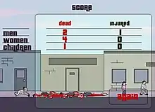 Players control a man, described as being of Arab appearance,[2] moving either left or right through a "vaguely Middle Eastern-looking"[3] street. Men, women and children walk back and forth along the street at various speeds. When the mouse is clicked, the man opens up his jacket, revealing an explosive belt, and detonates. The aim of the game is to kill and wound as many men and women as possible. Originally, players could also kill and wound children, however this feature was removed.[2] The number of people both killed and injured is displayed, and a button appears allowing the player to play the game again.