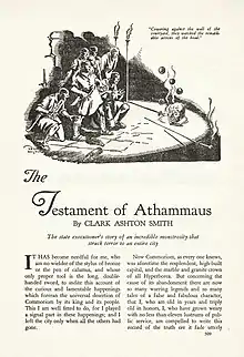 ![]() Title page of "The Testament of Athammaus" as it appeared in Weird Tales, October 1932. Illustration by T. Wyatt Nelson. | |