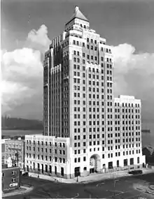 The West End grew up on the Brickmaker's Claim as "high class" residential housing, although this declined with the development of Shaugnessy by the CPR in 1911. Today, Vancouver's art-deco Marine Building marks the site of the Greenhorns’ log cabin.[9] At 22 stories and a height of 341 feet, the building overlooks the terminus of the Canadian Pacific Railway. The West End of Vancouver neighbours Stanley Park and the areas of Yaletown, Coal Harbour and the downtown financial and central business districts.[10]