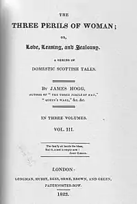 The Three Perils of Woman is a three volume work of one novel and two linked novellas by James Hogg. Following its original publication in 1823, it was omitted from Victorian editions of Hogg’s ‘’Collected Works’’ and re-published only in 2002.