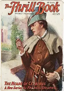 When Oliphant took over the editorship, he placed notices in writers' magazines looking for more submissions.[26][note 3] Much of the material published under Oliphant's editorship would have been bought by Hersey, making it hard to judge Oliphant's impact.[17] However, it is clear that Oliphant bought more science fiction and fantasy stories than Hersey had done:[13] in particular, Hersey had published almost no stories that were straightforward science fiction, though two he did purchase, Murray Leinster's "A Thousand Degrees Below Zero" and "The Silver Menace", appeared in the first few issues of Oliphant's editorship.[17] Stories such as "The Lost Days" by Trainor Lansing, which dealt with perceptions of time, and "The Ultimate Ingredient" by Greye La Spina, about invisibility, published in August and October respectively, were more evidence of this change in emphasis.[21] The most famous science fiction to appear in The Thrill Book was Francis Stevens' novel The Heads of Cerberus, which was one of the earliest fictional depictions of alternate timelines.[13][28] In addition to increasing the science fiction content, Oliphant also brought in authors who were better known than those published under Hersey's editorship, including H. Bedford-Jones and William Wallace Cook.[29] It seems likely that the fiction budget increased when Oliphant took control, and he used this to pay higher word-rates to the better writers. Hersey had paid about a cent per word for fiction, but Bedford-Jones received $800 for "The Opium Ship", which was a rate of between 2.5 and 3 cents per word. However, Francis Stevens was paid only $400, or less than a cent per word, for the much longer novel The Heads of Cerberus.[30] Poetry continued to appear, including several more poems by Hersey, and also including "Dissonance" by Clark Ashton Smith, whom Hersey had contacted in March asking for submissions in what Will Murray describes as "a rare instance of Hersey's editorial foresight".[28]