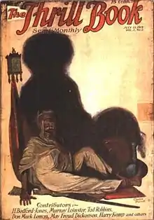 The first issue included "Wolf of the Steppes", a werewolf story by Greye La Spina. This had been submitted to The Popular Magazine but purchased by Clancy for The Thrill Book in 1918, when Street & Smith began making plans for the new magazine.[22][note 2] The story was the first by La Spina, whose real name was Fanny Greye Bragg; she would go on to publish several more stories in The Thrill Book, and later became a regular contributor to Weird Tales.[22] Another first story was "The Thing That Wept", by Charles Fulton Oursler, who later went on to edit Liberty and to write novels under the name Anthony Abbot.[22][24][25] Two serials were begun in the first issue: "The Jeweled Ibis" by J.C. Kofoed, and "In the Shadows of Race", by J. Hampton Bishop. Both contained enough fantastic or science-fictional elements to fit the original plans for the magazine: "The Jeweled Ibis" was about worshippers of the ancient Egyptian gods, and Bishop's story was about a lost race in Africa, and included intelligent apes.[21] The cover for the first issue was by Sidney H. Riesenberg; Bleiler describes it as "shabby and second-rate" by comparison to cover art in successful magazines of the day such as Adventure and Detective Story Magazine.[20] The May 1 issue included an early short story by Seabury Quinn, "The Stone Image", which features a character named Dr. Towbridge, who would later appear (renamed Dr. Trowbridge) in Quinn's popular occult detective stories about Jules de Grandin, though Quinn had not yet invented de Grandin. Tod Robbins, a well-regarded writer of fantasy, supplied several short pieces, all "shallow mood sketches" without much substance, in the opinion of science fiction historian Mike Ashley.[13] The contributors included Sophie Louise Wenzel, who later published stories in Weird Tales under the name Sophie Wenzel Ellis, but most of the writers from Hersey's editorship, such as George C. Jenks and John R. Coryell—both authors of dime novels—are no longer well-known names.[22]