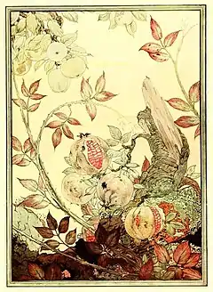 One of Aesop's Fables, numbered 213 in the Perry Index, concerns a pomegranate and an apple tree debating which is the most beautiful. In the midst of it, a bramble bush in a nearby hedge appeals to them, 'Dear friends, let us put a stop to our quarrel.' The account is brief and leads to the humorous moral that 'when there is a dispute among sophisticated people, then riff-raff also try to act important'.[2] The story was for a long time limited to Greek sources and, though versions of a similar debate between other trees gained some currency in the 16th and 17th centuries, it soon fell out of favour again. In 1564 the Neo-Latin poet Hieronymus Osius versified the story under the title "The Apple and the Pear", with the moral that the humble become overweening when the great fall out.[3] Charles Hoole's influential Aesop's fables English and Latin (1657) included it under the title "Of the Peach-tree and the Apple-tree" with the moral that "meaner men do oftentimes settle the controversies of their betters",[4] and is followed more or less by Roger L'Estrange, who concludes that "Every thing would be thought greater in the World than it is".[5]