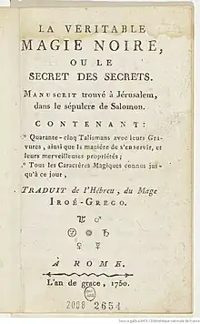 The True Black Magic (French: La véritable magie noire), also known as The secret of secrets, is a pseudepigraphical grimoire or book of spells attributed to King Solomon.[1] It probably dates back to the 14th or 15th century.