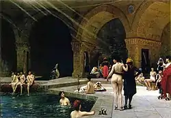 The Turkish Bath (Le Bain turc) is an oil painting by Jean-Auguste-Dominique Ingres, initially completed between 1852 and 1859, but modified in 1862.[1] The painting depicts a group of nude women at a pool in a harem.[1] It has an erotic style that evokes both the Near East and earlier western styles associated with mythological subject matter. The painting expands on a number of motifs that Ingres had explored in earlier paintings,[1] in particular The Valpinçon Bather (1808) and La Grande odalisque (1814).