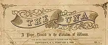 In 1853, The Una, a paper devoted to the enfranchisement of woman, owned and edited by Paulina Wright Davis, was first published in Providence, Rhode Island.[1][2] The Una was the first paper focused on woman suffrage, and the first distinctively woman's rights journal ever published.[3] Its mystical name signified "truth", to be used as a constant suggestion of fidelity to all. The Una had many notable correspondents such as William H. Channing, Elizabeth Peabody, Thomas Wentworth Higginson, Rev. A. D. Mayo, Dr. William Elder, Ednah D. Cheney, Caroline H. Dall, Fanny Fern, Elizabeth Oakes Smith, Frances D. Gage, Hannah Tracy Cutler, Abby H. Price, Marion Finch, of Liverpool, Hon. John Neal, of Portland, Lucy Stone, and Elizabeth Cady Stanton.[4] For nearly three years Davis continued The Una, doing so entirely at her own expense. It took the broadest ground claimed of that day: individual freedom in the State, the Church, and the home; woman's equality and suffrage as a natural right.[3]