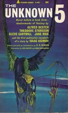 The Unknown Five is an anthology of American fantasy fiction short stories edited by D. R. Bensen and illustrated by Edd Cartier, the fourth of a number of anthologies drawing their contents from the American magazine Unknown of the 1930s-1940s. It was first published in paperback by Pyramid Books in January 1964. The cover title of this first edition was The Unknown 5; the numeral was spelled out on the title page and copyright statement. The book was reprinted by Jove/HBJ in October 1978. It has also been translated into German.[1] It was a follow-up to a companion anthology, The Unknown, issued in 1963.