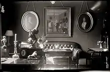 That the two oval portraits on the wall are Jens Juel's portraits of Waagepetersen's parents Lorentz Petersen (1763-1829) and below them is a portrait of Frederik VI.[4] The frog in the tall glass cylinder on the mahogany desk was used as a sort of primitive barometer: Whenever the frog moved up to the surface it meant fair weather.[5]