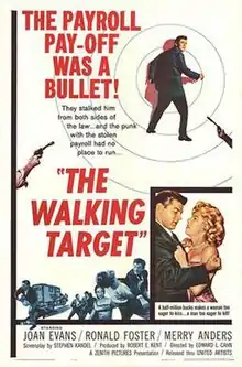 The Walking Target is a 1960 crime film directed by Edward L. Cahn and starring Joan Evans, Merry Anders, and Ronald Foster. The screenplay concerns an ex-con who, upon release from prison, sets out to retrieve the $260,000 he hid before he was arrested, and finds unexpected romance with the widow of his former partner in crime.[1][2][3]