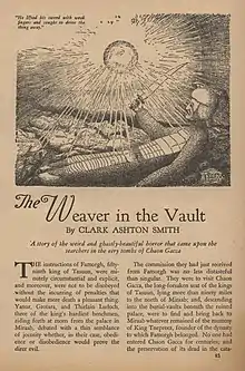 ![]() Title page of "The Weaver in the Vault" as it appeared in Weird Tales, January 1934. Illustration by Clark Ashton Smith. | |