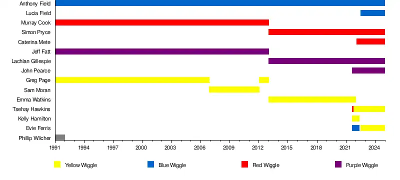 The Wiggles are an Australian children's music group formed in Sydney in 1991. As of 2022, the group members are Anthony Field, Lachlan Gillespie, Simon Pryce, Tsehay Hawkins, Evie Ferris, John Pearce, Caterina Mete and Lucia Field. The Wiggles were founded in 1991 by Field, Murray Cook, Jeff Fatt, Greg Page and Phillip Wilcher. Wilcher left the group after their first album. Page retired in 2006 due to ill health and was replaced by understudy Sam Moran, but returned in 2012, replacing Moran. At the end of 2012, Cook, Fatt and Page retired and were replaced by Gillespie, Pryce and Emma Watkins. Cook and Fatt retained their shareholding in the group and all three continued to have input into its creative and production aspects, while engaging in occasional reunion performances. Watkins departed the group in 2021, with Hawkins taking her place.