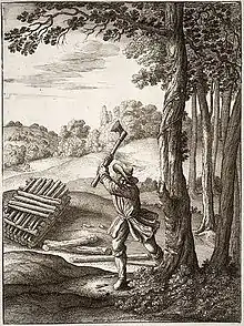 This version was taken up early by the Anglo-French poet Marie de France[9] and was also preferred by 15th century collectors of fables in European vernaculars like Heinrich Steinhowel and William Caxton. During Renaissance times it was made the subject of poems by the German Neo-Latinists Hieronymus Osius[10] and Pantaleon Candidus.[11] Jean de la Fontaine also made it the subject of his La forêt et le bûcheron (Fables X11.16), translated by Elizur Wright as "The Woods and the Woodman".[12] In his telling, the woodman breaks his promise to work further off and not harm his benefactors. A version based on this was set for accompanied children's voices by the composer Rudolf Schmidt-Wunstorf (b. 1916).