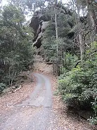 From near the Boolijah Peak, The Wool Road diverged from the current route of the Braidwood Road and followed the route of modern-day Wandean Road, through the steep Wandean Gap.[13] (historically also known as the Jerrawangala Gap[14]), then following ridgelines of tributaries of Wandandian Creek, to Wandandian.[13] In this section, the road's elevation dropped by approximately 2,500 feet in 10 miles[14] (760m in 16 km), as it descended the coastal escarpment, via the locality of Jerrawangala and Wandandian. Most of this part of the route is now only accessible to four-wheel drive traffic.[15]